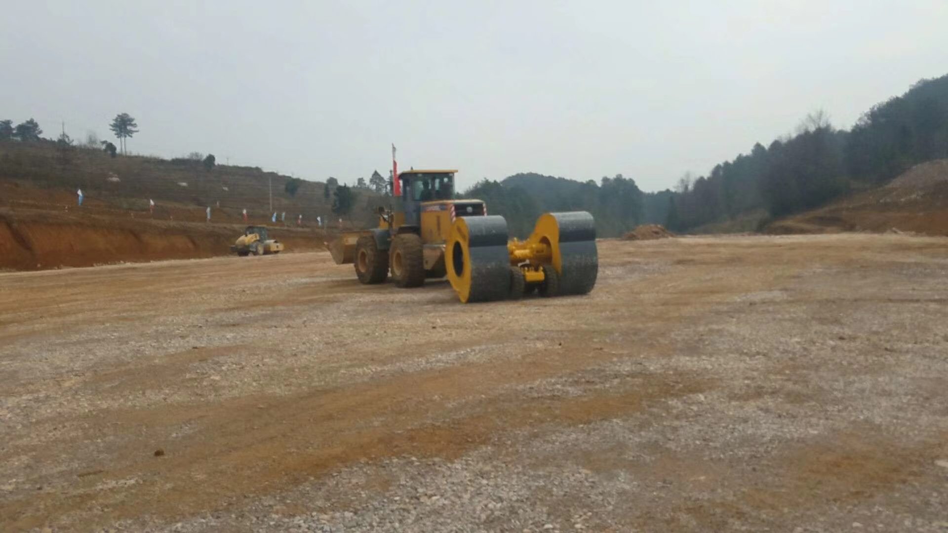以SD30三葉凸型輪沖擊式壓路機為例,行駛以12km/h速度進行碾壓,對地面的沖擊力2000-2500KN,相當于1111-1543Kpa。沖擊壓路機進行煤矸石路基補強碾壓時,相比其它壓路機械沖擊力度更大。