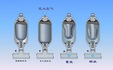 因此,沖擊機(jī)械液壓系統(tǒng)中設(shè)計(jì)蓄能器是系統(tǒng)共性,其目的是為了吸收這種壓力脈動(dòng)和液壓沖擊,同時(shí),在正常工作時(shí)吸收儲(chǔ)存供過于求的能量。吸收液壓沖擊壓力和脈動(dòng)壓力是蓄能器*重要的工業(yè)應(yīng)用之一。