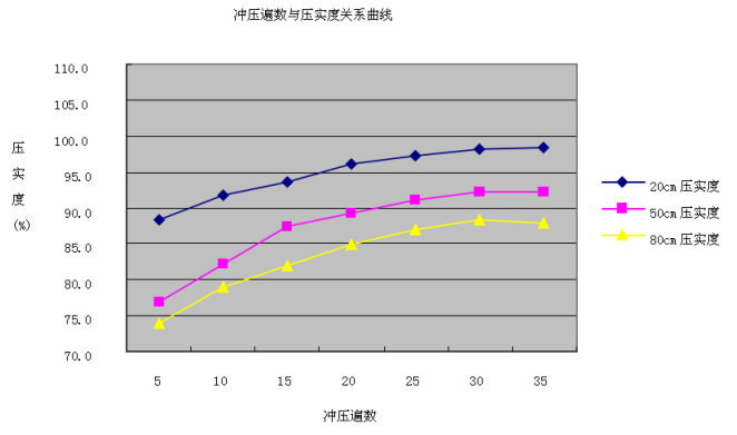 雖然沖擊壓實(shí)技術(shù)已在全國廣泛采用,但由于土質(zhì)、沖壓壓路機(jī)型號,應(yīng)用條件等各不相同,其壓實(shí)效果、施工工藝、質(zhì)量控制亦不相同,因此需要在施工前修筑試驗(yàn)路段,以確定合適的施工工藝,質(zhì)量控制標(biāo)準(zhǔn)。